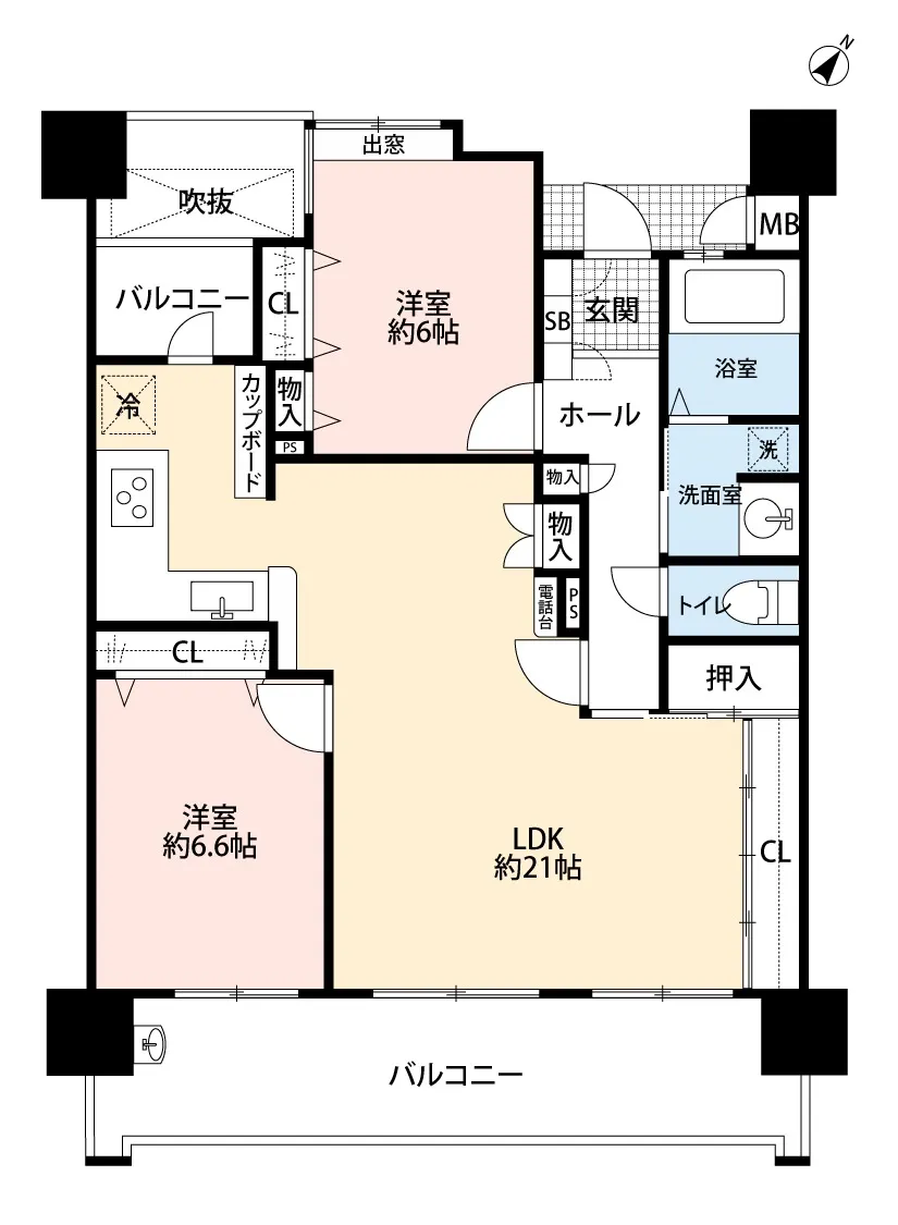 専有面積75m2の2LDK LDK21帖超 各居室6畳以上のゆとり空間♪